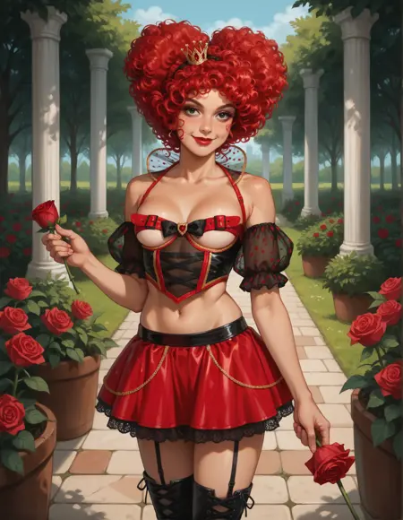 1girl, solo, 赤いカールのアフロ, クラウン, メイク, リップスティック, hud_r3d_qu33n, スカート, アンダーブレスト, クロップトップ, 外側に膨らんだ袖, 肩出し, ワタリソックス, ガーターストラップ, プラットフォームブーツ,