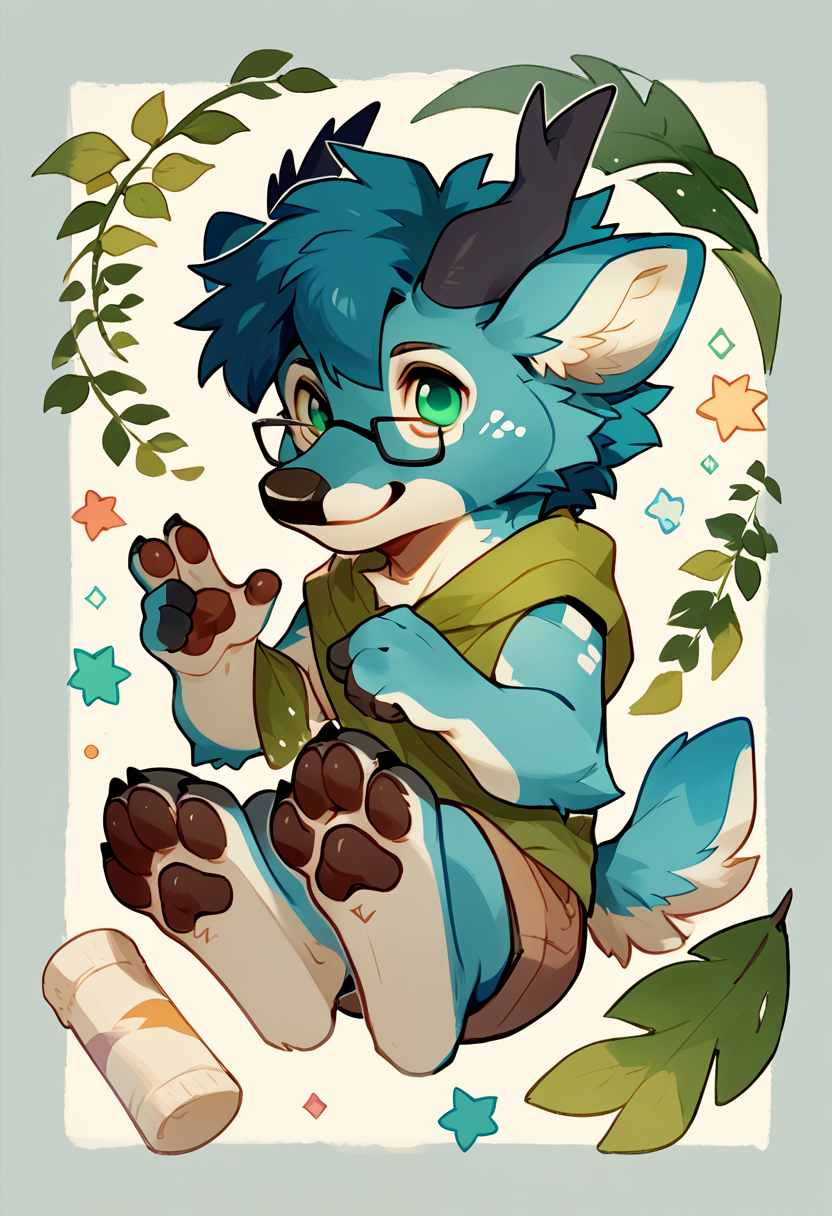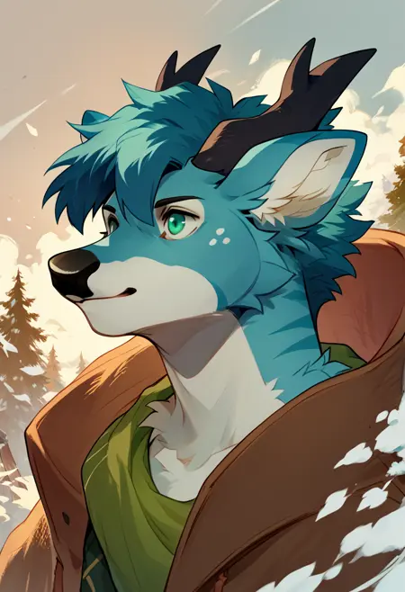 Illustrious: best quality, amazing quality, very aesthetic, absurdres, newest, mintelon_deer_oc, mintealon, furry, 1boy, solo, blue fur, blue hair, green eyes, short hair, horns