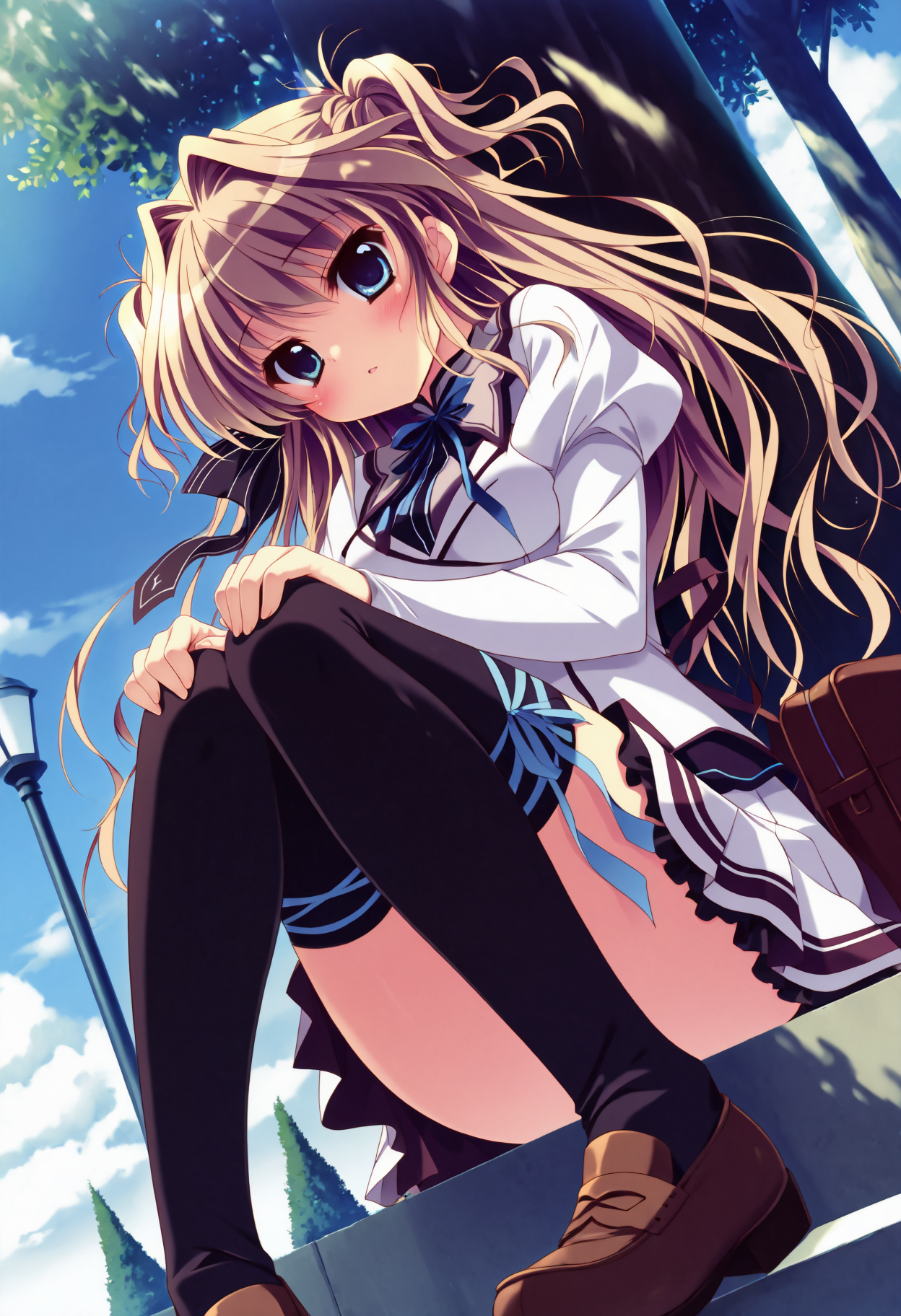 学校制服、長袖、スカート、太ももリボン、絶対領域、黒いタイツ、ローファー、