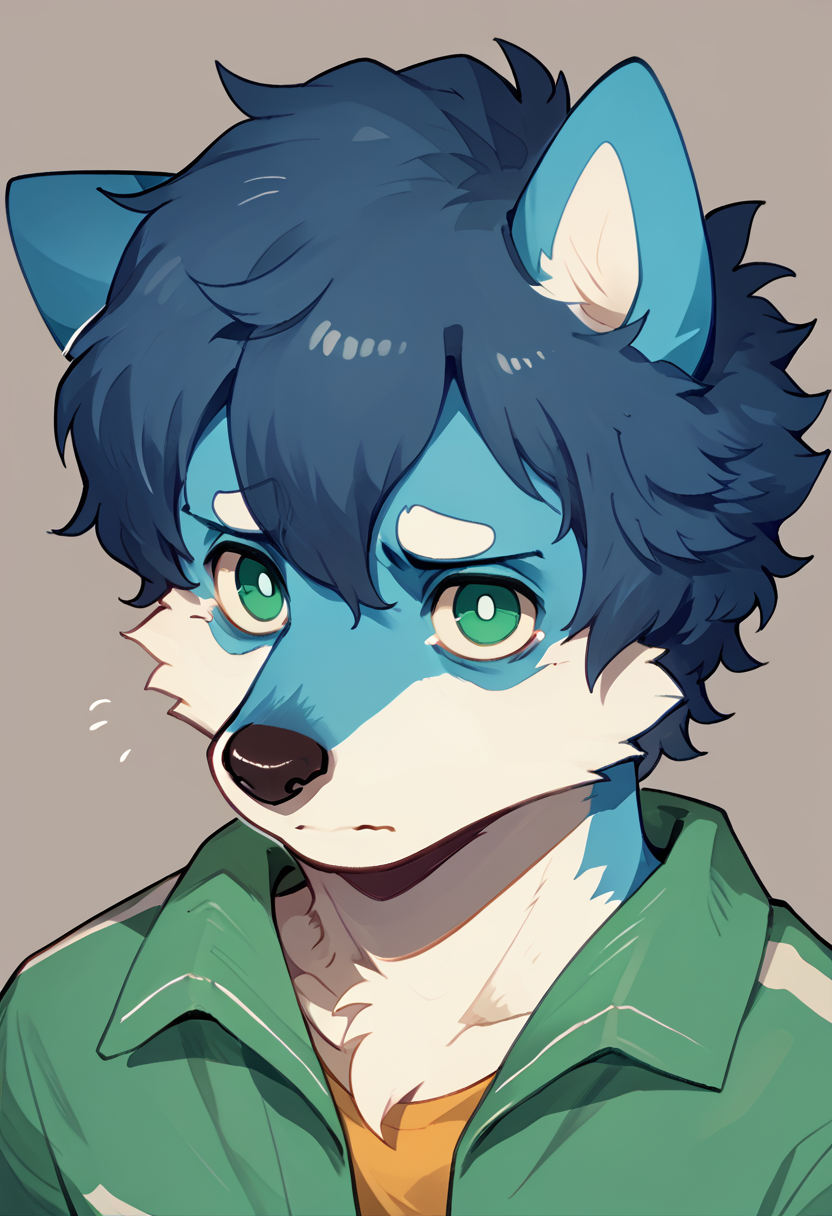 Illustrious: best quality, amazing quality, very aesthetic, absurdres, newest, mintelon_dog_oc, mintealon, furry, furry male, 1boy, solo, white eyebrows, blue hair, short hair, jacket