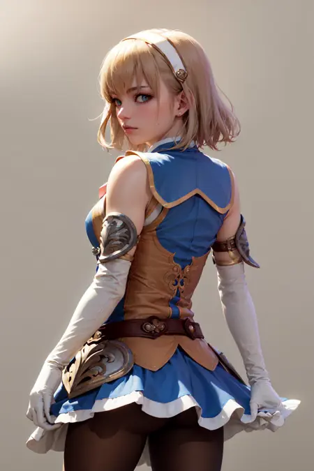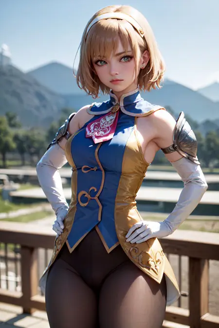 如需,可添加 金色头发 和 绿色眼睛。未针对特定服装进行训练,因此结果会有所变化。