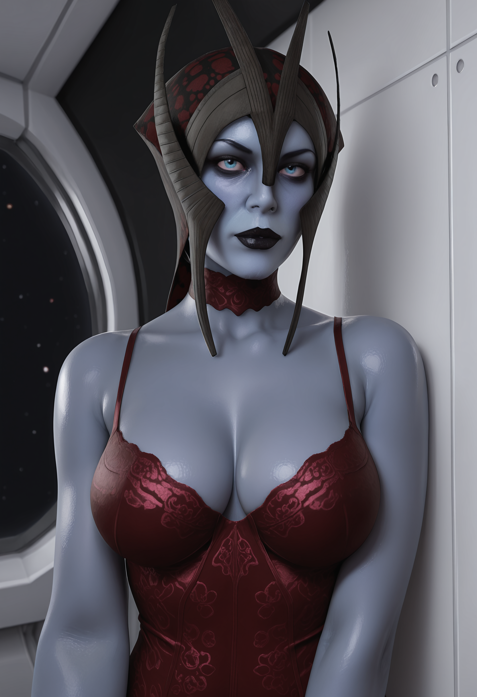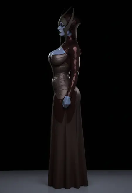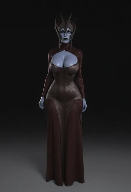 mtrilf、青い肌、色付きの肌、青い目、黒い唇、頭飾り、ドレス、胸、胸元の開き