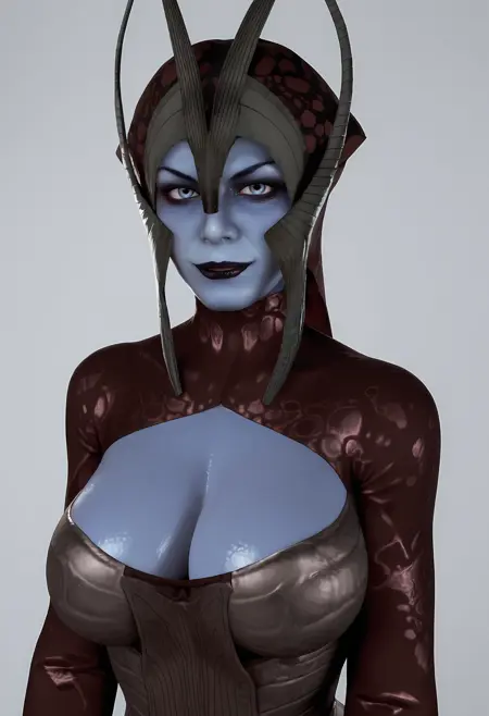 mtrilf, blue skin, colored skin, blue eyes, black lips, headdress, dress, breasts, cleavage