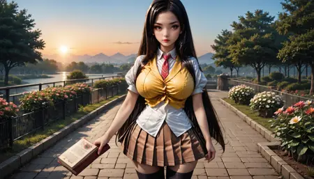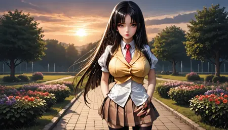 トリガー+外見 V1: 3nah1me、タイツ、ネクタイ、スカート、制服、黒髪、黒目