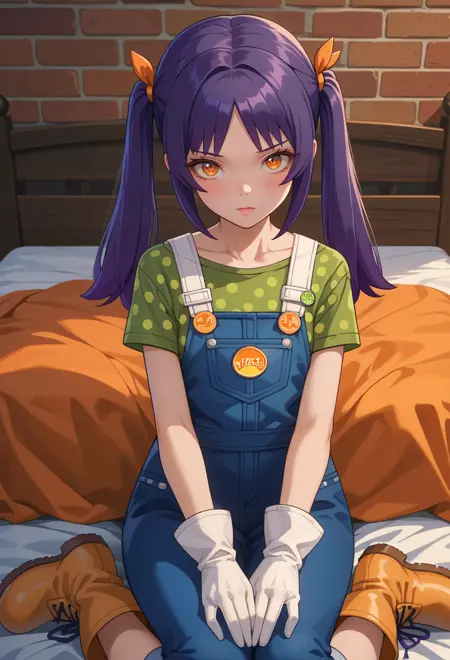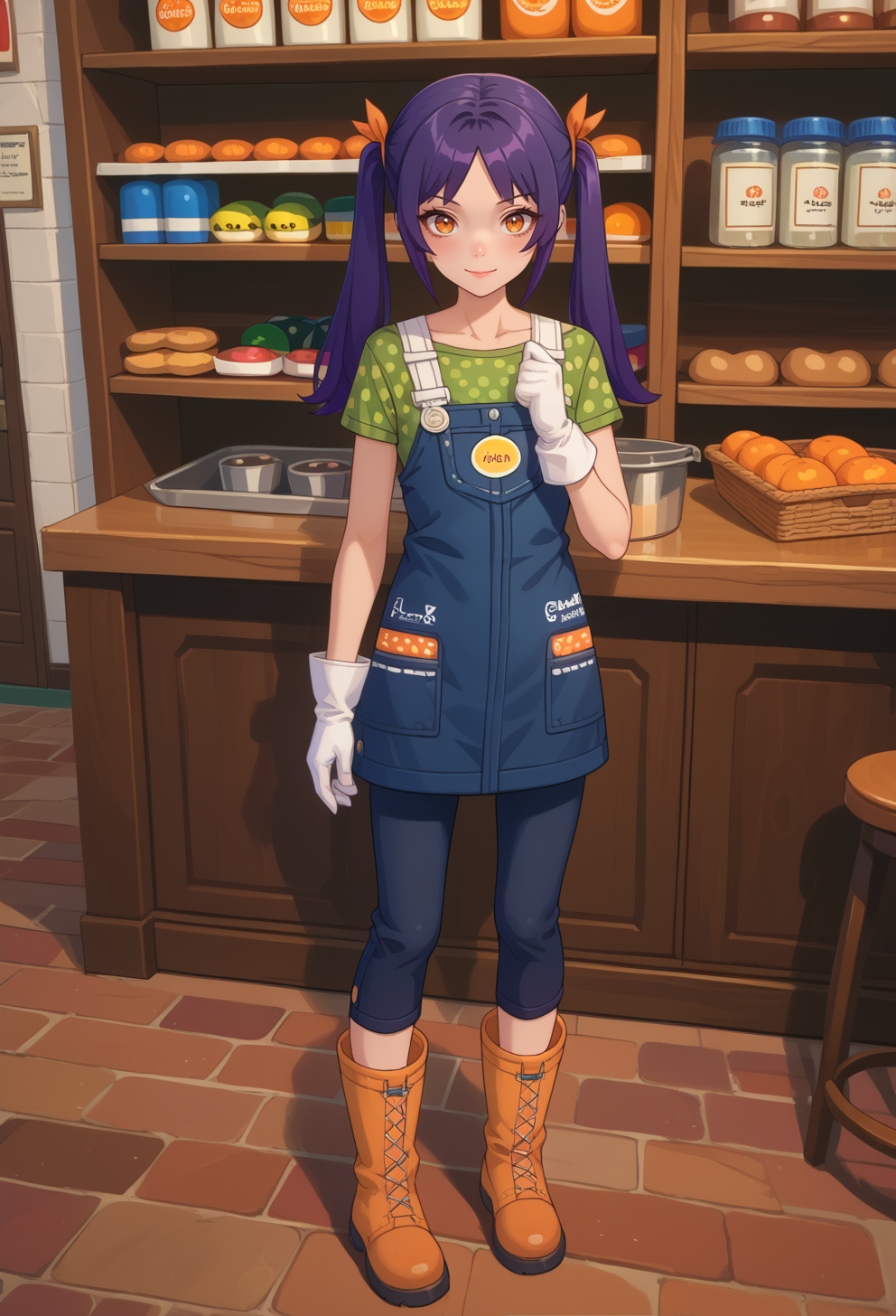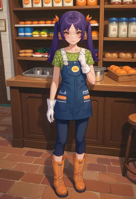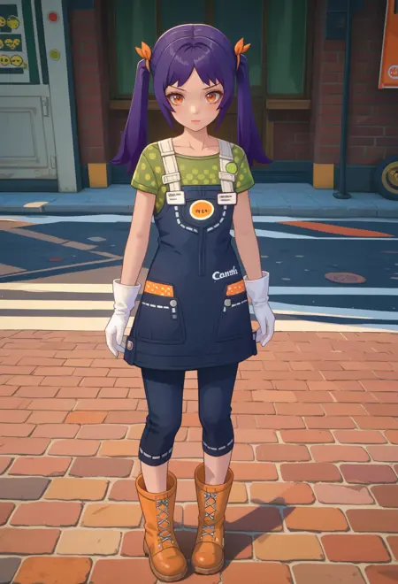 머리 리본, 주황색 리본, 배지, 파란색 오버올, 녹색 셔츠, 점무늬 셔츠, 짧은 소매, 흰 장갑, 오버올 치마, 카프리 바지, 부츠, 노란 신발,