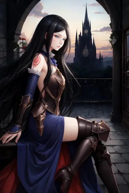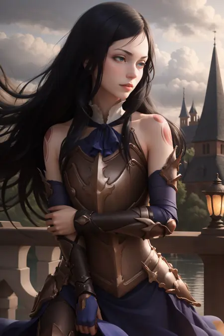 Add "tattoo, armor, blue dress, detached sleeves, thigh boots" for her typical look.