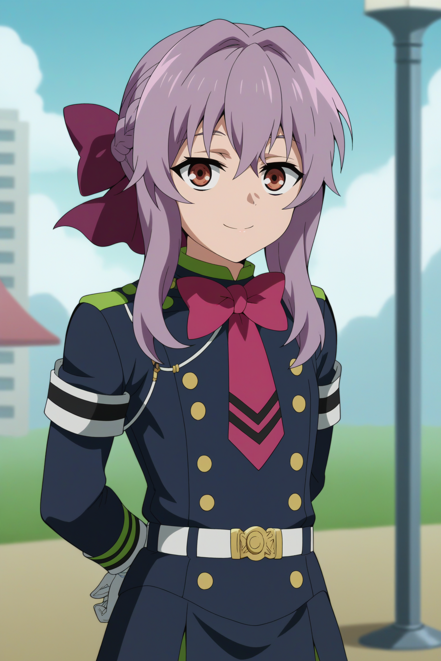 트리거: 1girl, solo, shinoa hiragi, gloves, long hair, white gloves, uniform, military, braid, purple bow, black thighhighs, zettai ryouiki