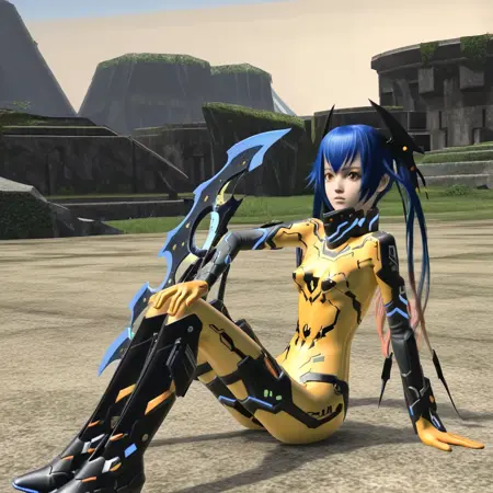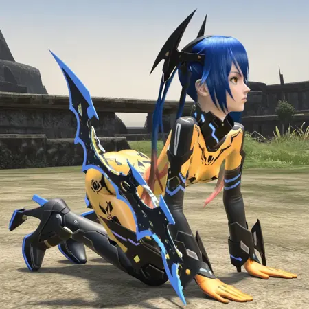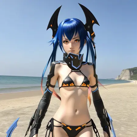 | 학습된 단어 | quna_assassin, orange eyes, headgear, blue hair, gradient hair, long hair, twintails, hair flaps, small breasts, 복사됨! black collar, black sleeves, orange gloves, orange bodysuit, exoskeleton, skin tight, black boots, high heels, mechanical tail, armblades, 복사됨! |