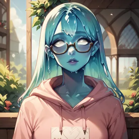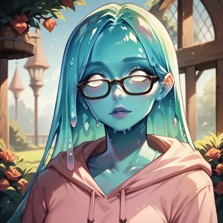 例: slime, slime body, transparent body, 1girl, green skin, yellow eyes,