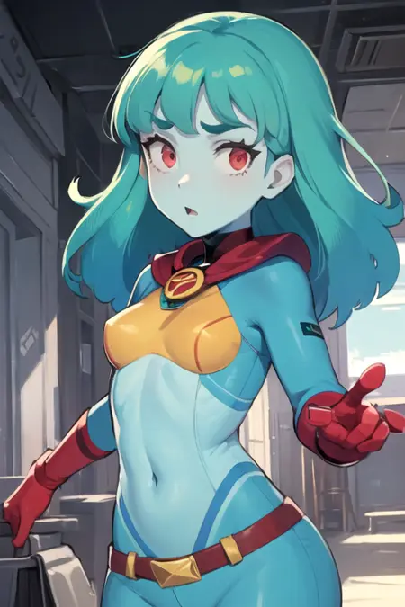 Planetina, 1girl, solo, long hair, red gloves, green hair, belt, blue bodysuit, colored skin, blue skin