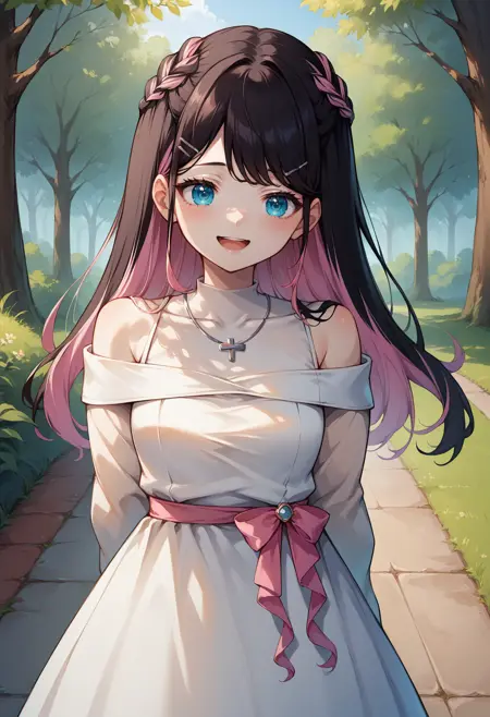 NazunaSnd, blue eyes, multicolored hair, black hair, pink hair, long hair, braid, hairclip, necklace, covered collarbone, off-shoulder dress, bare shoulders, white dress, long sleeves