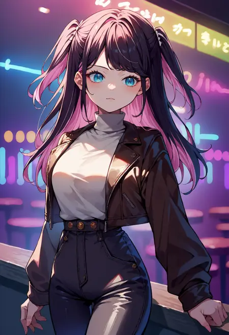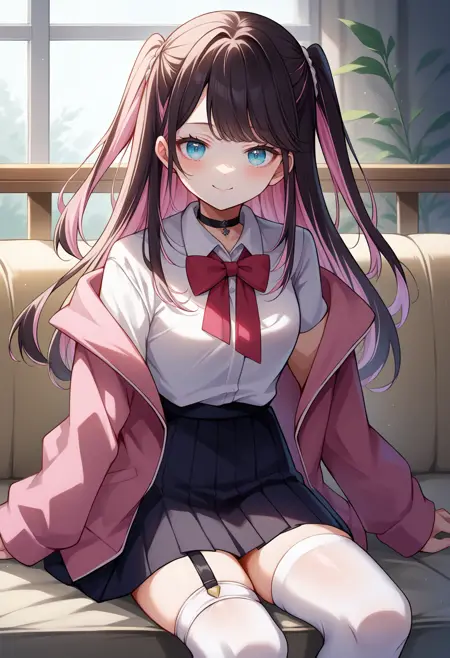 NazunaOriginal, blue eyes, multicolored hair, black hair, pink hair, long hair, two side up, black choker, white shirt, collared shirt, red bowtie, pink jacket, hooded jacket, black skirt, uneven legwear, white thighhighs, single garter strap