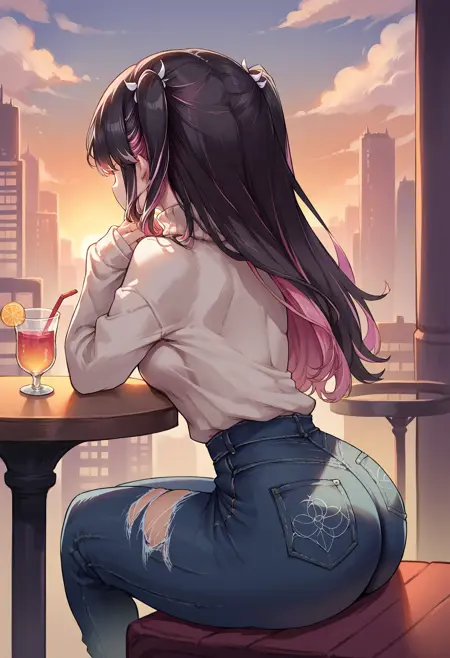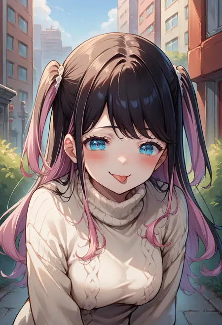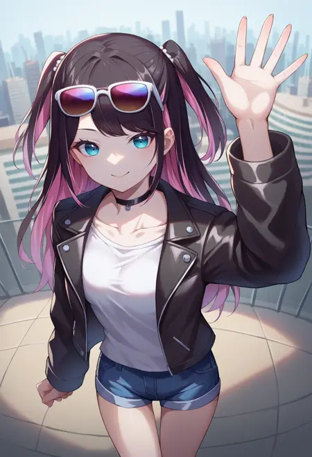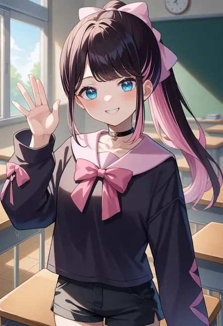 NazunaUni, blue eyes, multicolored hair, black hair, pink hair, long hair, ponytail, pink hair bow, black choker, pink sailor collar, pink bowtie, black shirt, long sleeves, black shorts
