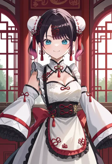 NazunaChn, blue eyes, multicolored hair, black hair, pink hair, short hair, double bun, bun cover, red hair ribbon, qi maid, chinese clothes, white dress, sleeveless dress, frills, cleavage, black corset, waist apron, detached sleeves, sleeves past wrists