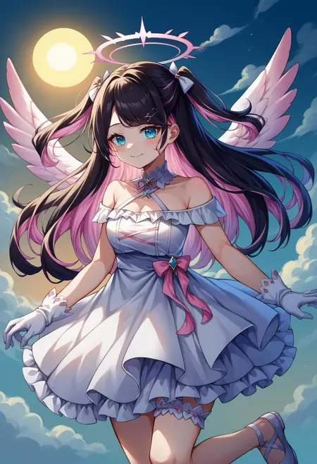 NazunaAngl, blue eyes, multicolored hair, black hair, pink hair, long hair, two side up, white hair ribbon, hairclip, halo, wings, detached collar, white dress, criss-cross halter, off-shoulder dress, frills, white half gloves, bridal garter