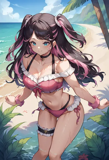 NazunaSmmer, blue eyes, multicolored hair, black hair, pink hair, long hair, two side up, hairclip, black choker, frilled bikini, off-shoulder bikini, pink bikini, wrist scrunchie, leg garter
