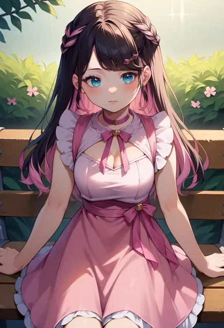 NazunaCas, blue eyes, multicolored hair, black hair, pink hair, long hair, braid, hairclip, pink choker, pink dress, pink neck ribbon, short sleeves, frilled sleeves, cleavage cutout, pink waist ribbon, ribbon belt