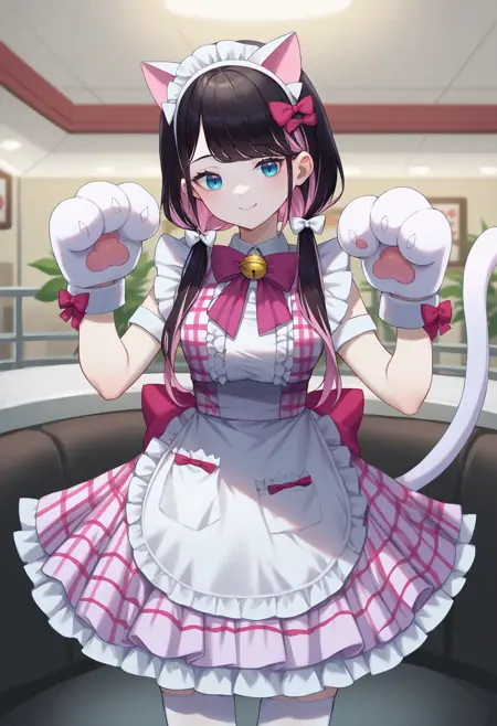 NazunaMdCaf, blue eyes, multicolored hair, black hair, pink hair, long hair, low twintails, maid headdress, fake animal ears, hair bow, pink bowtie, maid, pink dress, plaid dress, maid apron, short sleeves, back bow, animal hands, animal ear legwear, cat tail