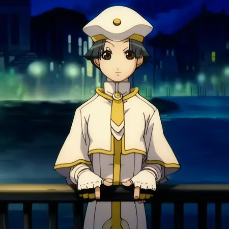 설명: 매우 짧은 머리, 검은 머리, 갈색 눈, 유니폼, 흰 드레스, 오렌지색 행성 유니폼, 모자, 손가락 없는 장갑, 흰 장갑, 흰 카프레트, 높은 칼라, 넥타이, 흰 신발