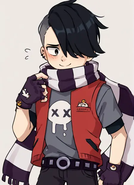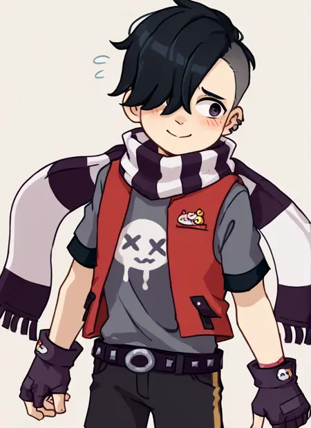 , solo,striped scarf ,red vest , grey shirt, short sleeves, belt , black pants ,black gloves, fingerless gloves,