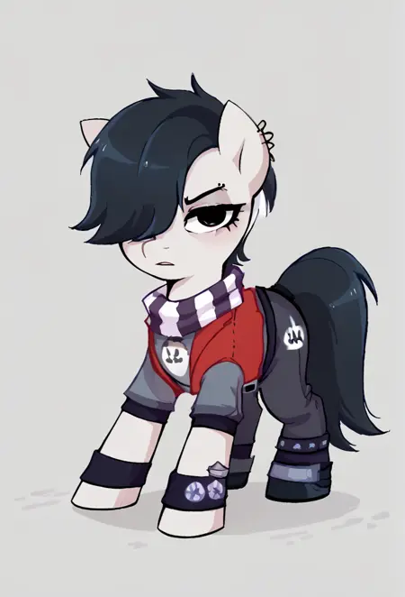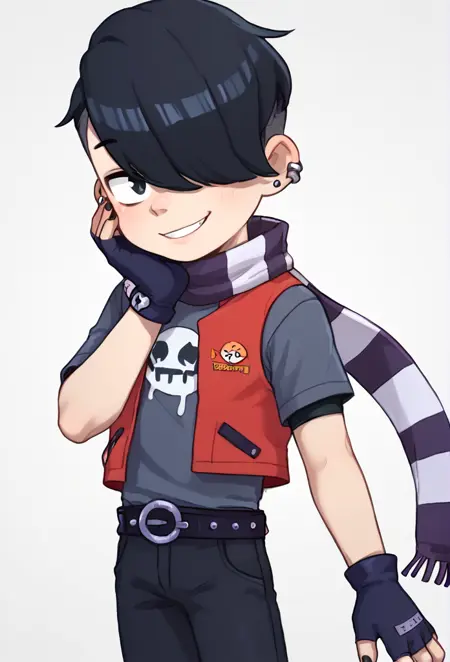bsedgar , 1boy , red vest , short hair , black hair, hair over one eye, ear piercing, solo,striped scarf grey shirt, short sleeves, belt , black pants ,black gloves, fingerless gloves, black nails,