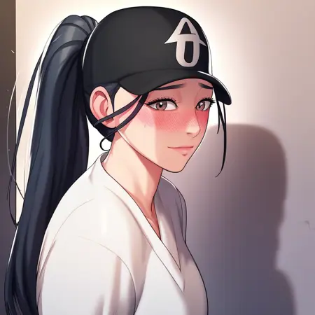 4. ((black baseball cap, long sleeves white top, black sport shorts, )) + white socks, white sneaker, ponytail