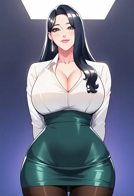 6. ((formal, long earrings, sexy white shirt, obscene cleavage, huge cleavage, sexy green pencil skirt, dark brown pantyhose, ))