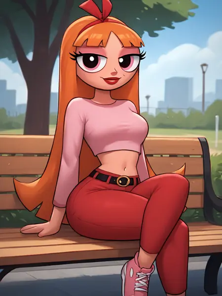 T66nBl0ss0m, 1girl, solo, long hair, orange hair, very long hair, navel, midriff, red lips, ribbon, red pants, crop top, pink top, belt, pink shoes,