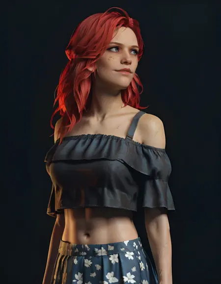 -black bohemian outfit,long hair,skirt, navel, bare shoulders, midriff,red hair