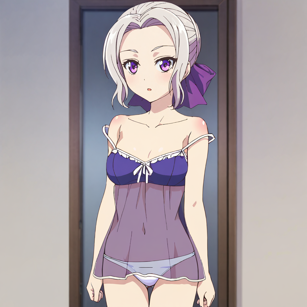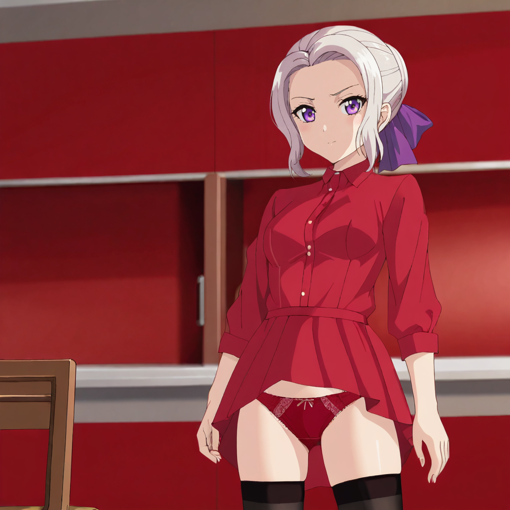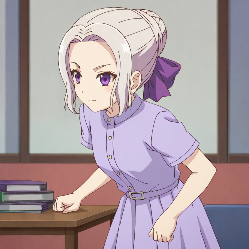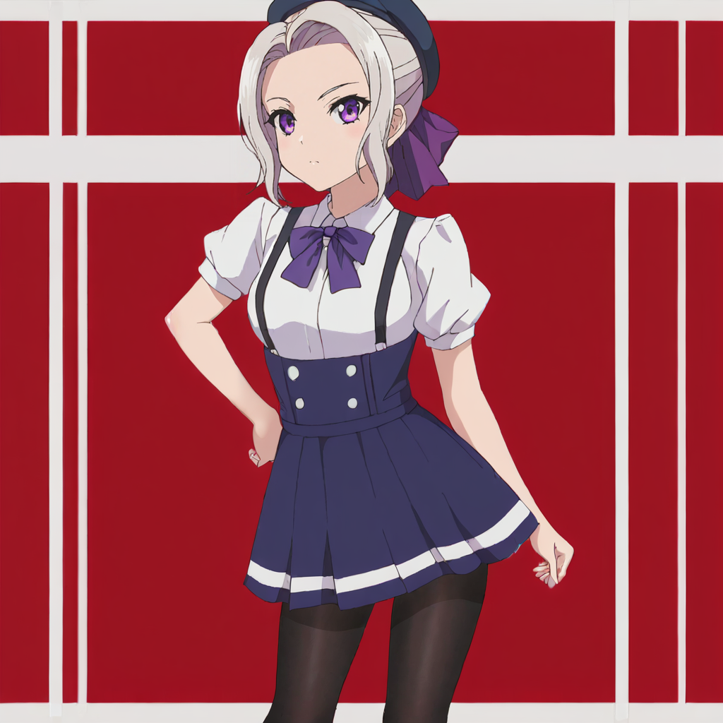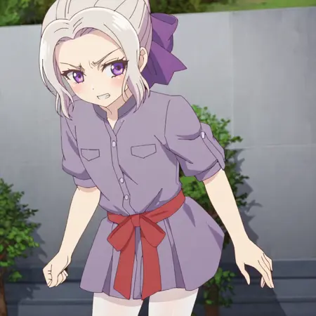 紫のドレス2付きトリガー:ShinoPurpleDress, solo, 1girl, purple eyes, purple ribbon, red pantyhose, dress, hair ribbon, hair bun, short sleeves, white hair, purple bow, cowboy shot