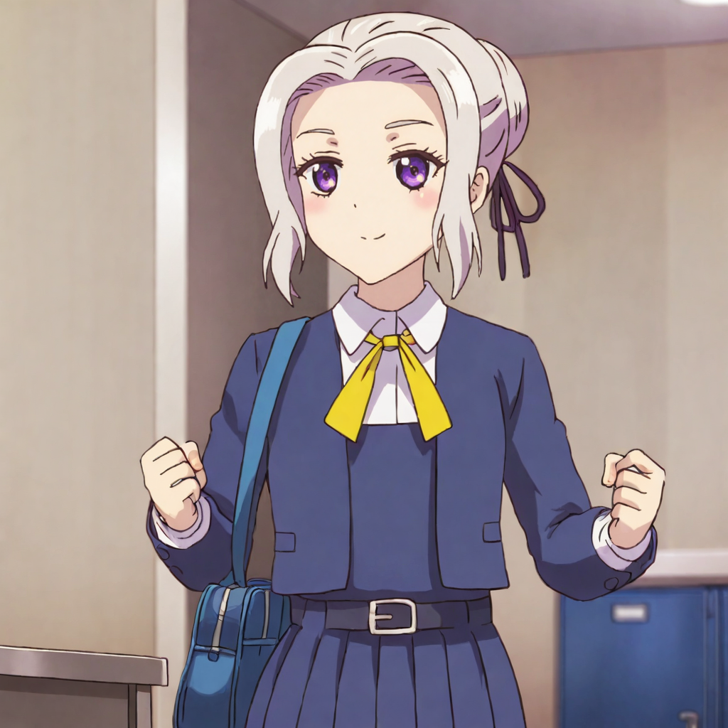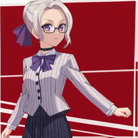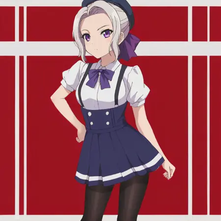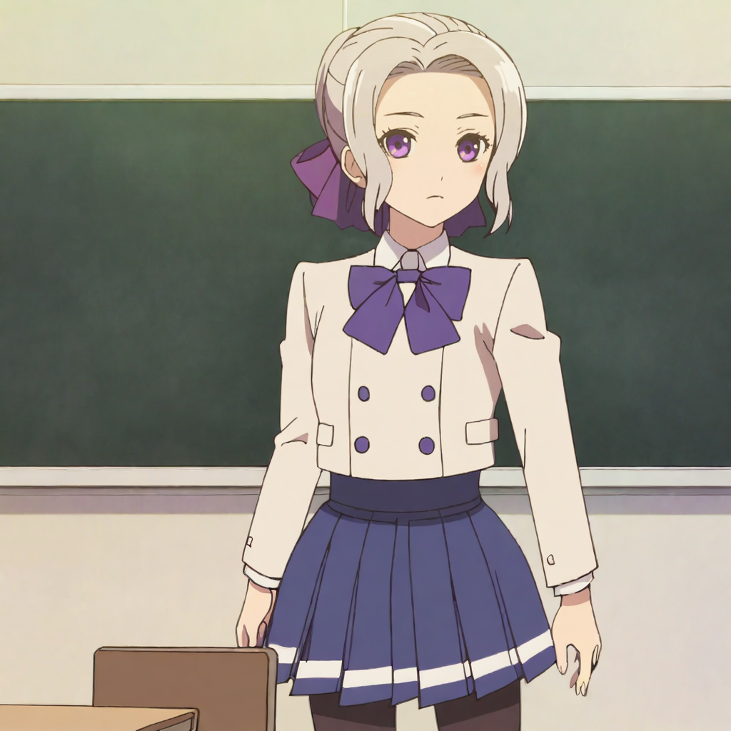 別の学校制服付きトリガー:ShinoAlternativeOutfit, 1girl, school uniform, purple eyes, hair ribbon, single hair bun, white hair, belt, long sleeves, cowboy shot