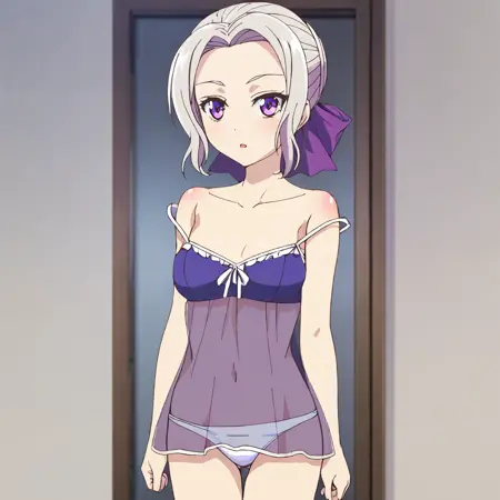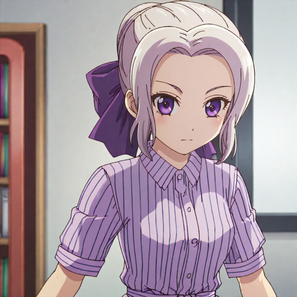 紫のドレス3付きトリガー:ShinoPurpleDress2, 1girl, purple eyes, purple dress, hair bow, short sleeves, striped dress, purple bow, white hair, purple ribbon, cowboy shot