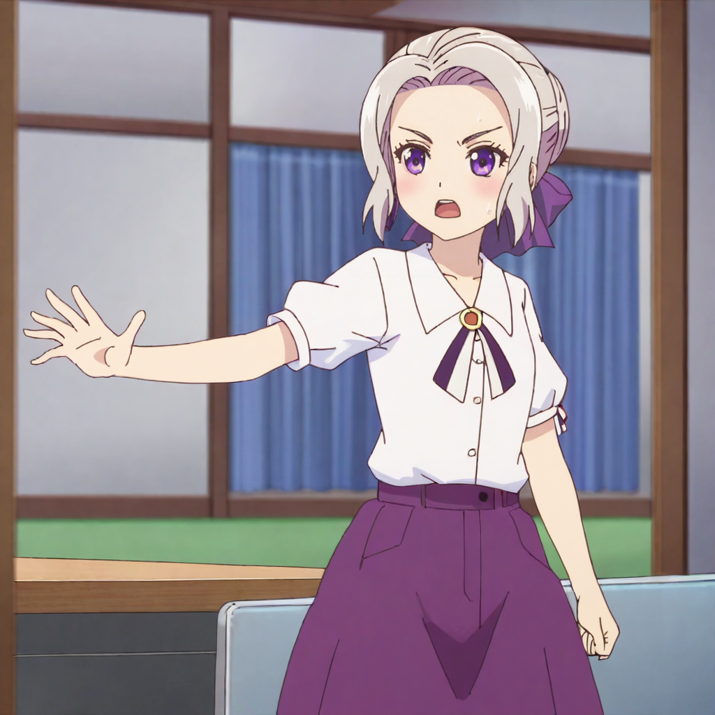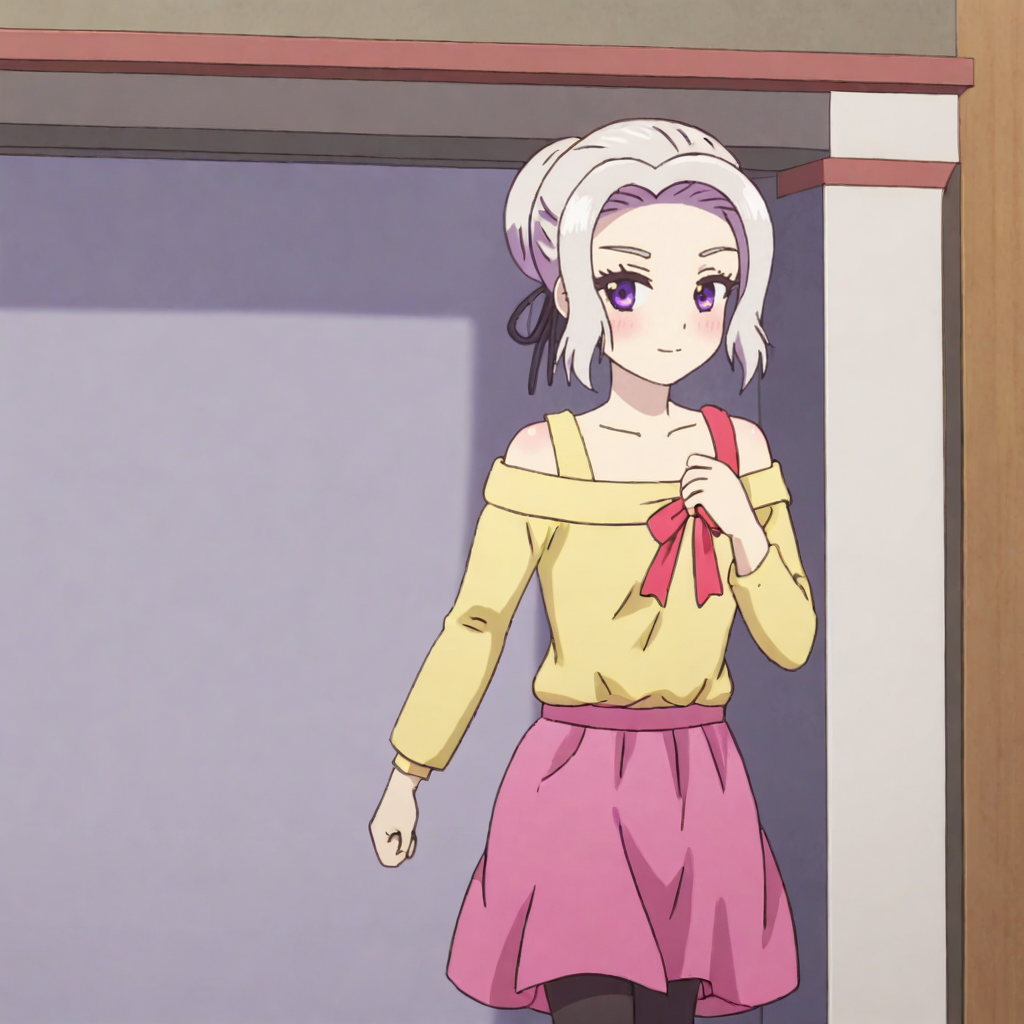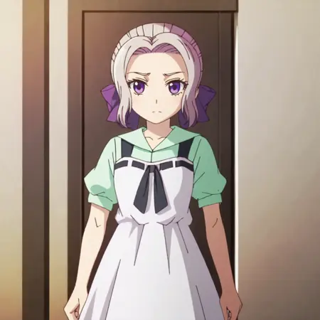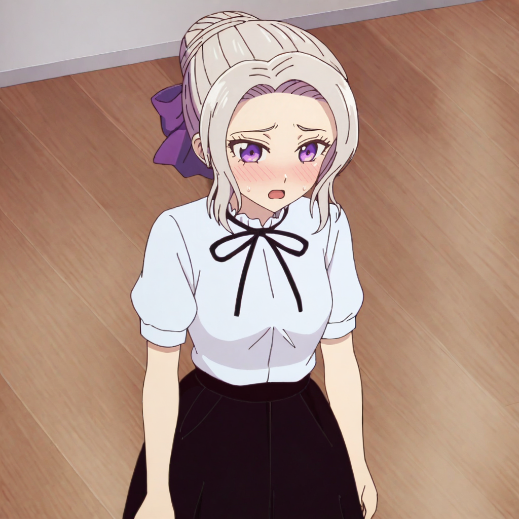 黒いボウタイドレス付きトリガー:ShinoBlackBowtie, 1girl, single hair bun, black skirt, purple eyes, neck ribbon, white shirt, long skirt, short sleeves, hair ribbon, purple ribbon, grey hair, puffy sleeves, black ribbon, cowboy shot