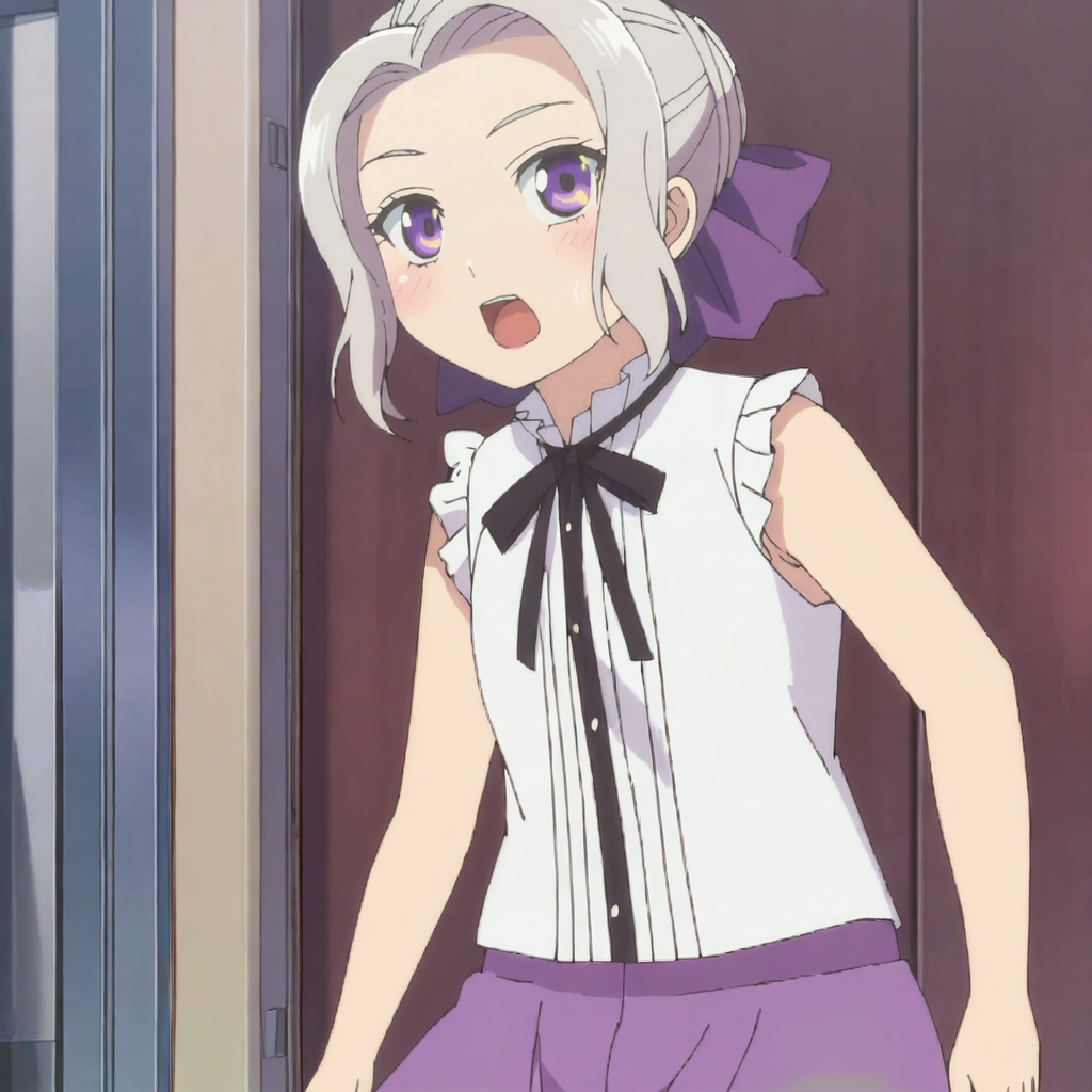シャツを開けた姿付きトリガー:ShinoOpenShirt, 1girl, purple eyes, medium breasts, black pantyhose, purple skirt, hair ribbon, short hair, sleeveless shirt, white shirt, hair bow, grey hair, cowboy shot