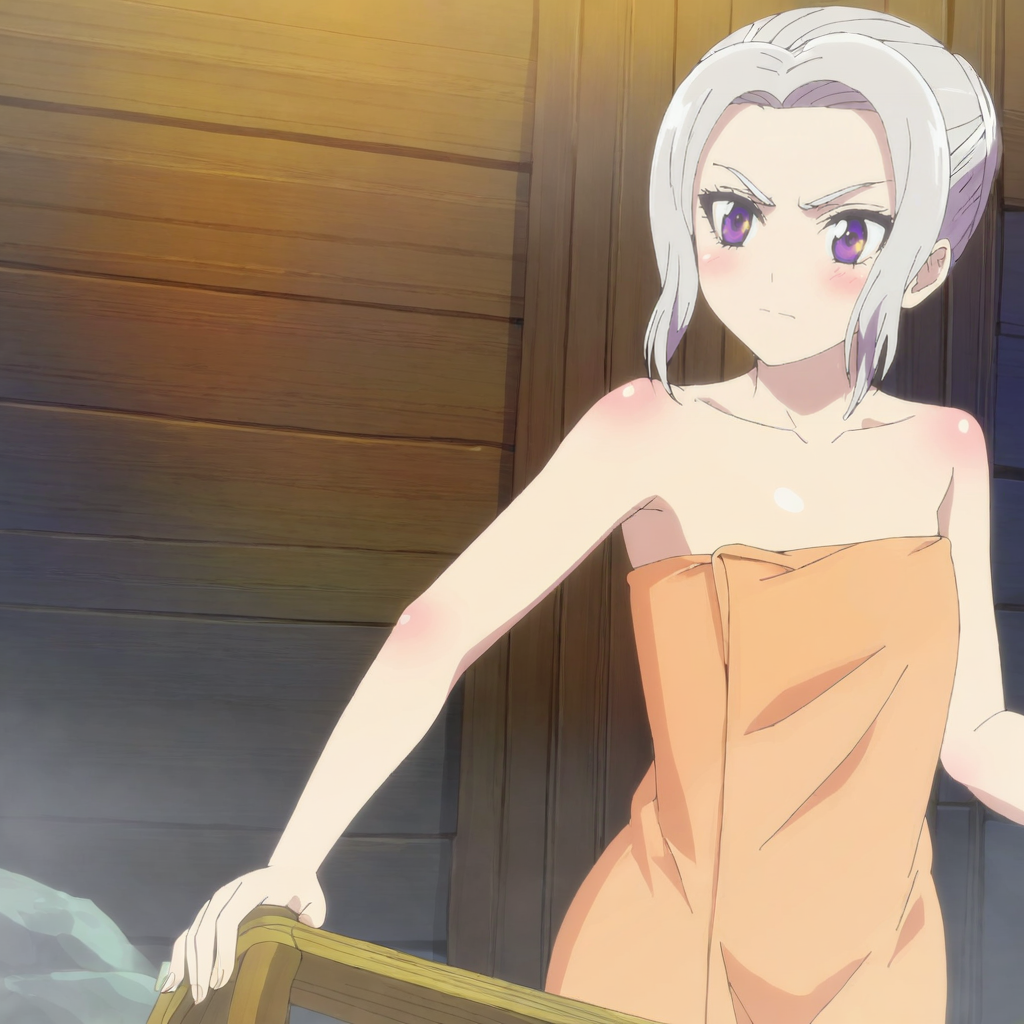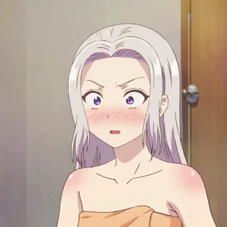 タオル付きトリガー:ShinoTowel, 1girl, naked towel, purple eyes, white hair, bare shoulders, cowboy shot