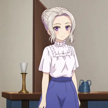 紫のドレス付きトリガー:ShinoAnotherPurpleDress, 1girl, black pantyhose, medium breasts, purple eyes, blue skirt, single hair bun, white shirt, grey hair, alternate hairstyle, short sleeve, standing, cowboy shot