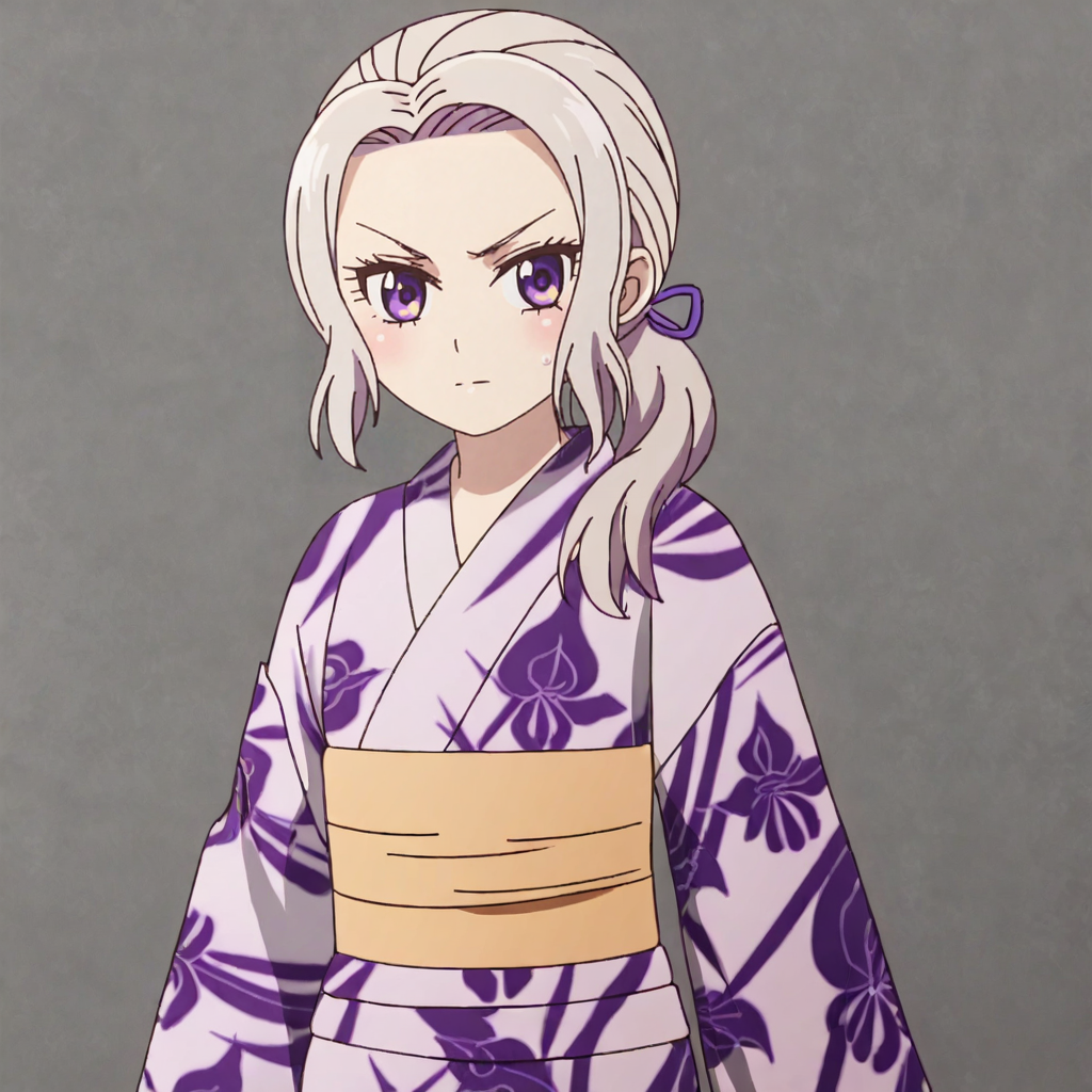 着物付きトリガー:ShinoKimino, japanese clothes, kimono, medium breasts, purple eyes, yukata, white hair, 1girl, alternate hairstyle, long hair, obi, sash, long sleeves, cowboy shot