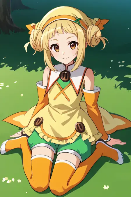 yellow headdress, yellow hat, food-themed clothes, detached sleeves, bare shoulders, pale yellow dress, orange thighhighs, green shorts