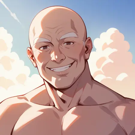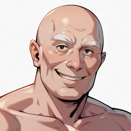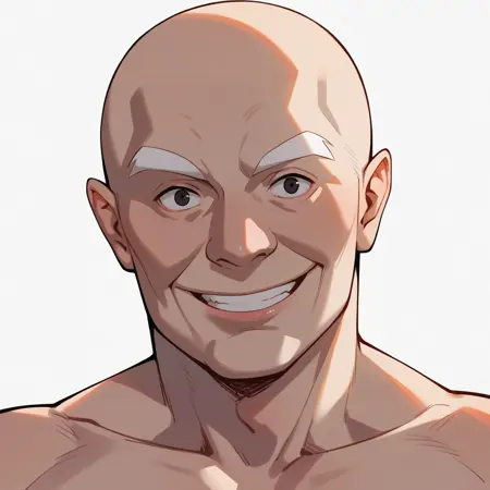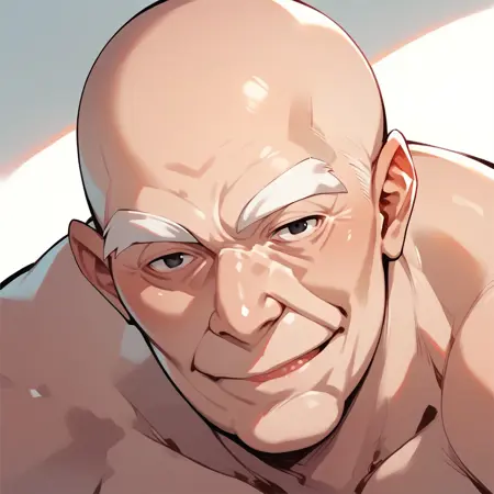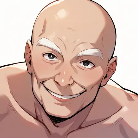 score_9, score_8_up, score_7_up, score_6_up, score_5_up, score_4_up, BREAK, anime, anime style, 1boy, old man, solo,bald, 68 years old, black eyes, white eyebrows, open eyes, smile,