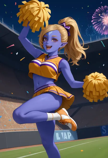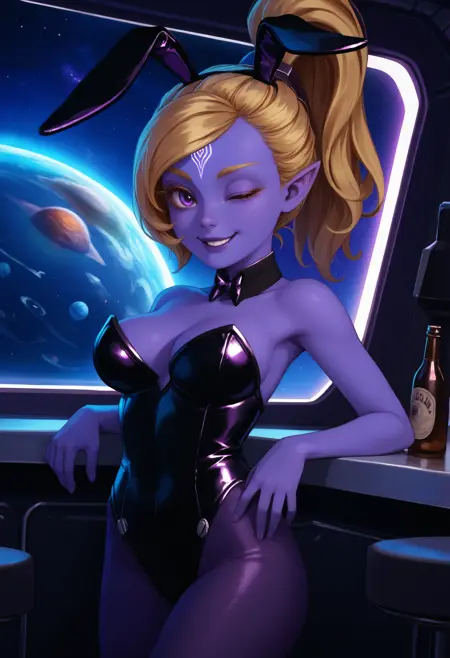 常に必要: "sovasub、紫肌、紫目、まつげ、尖った耳、紫唇、金髪、高いポニーテール、長い髪、額の模様、大きな胸"