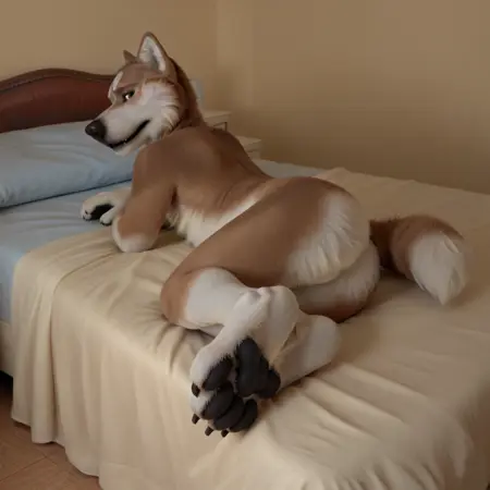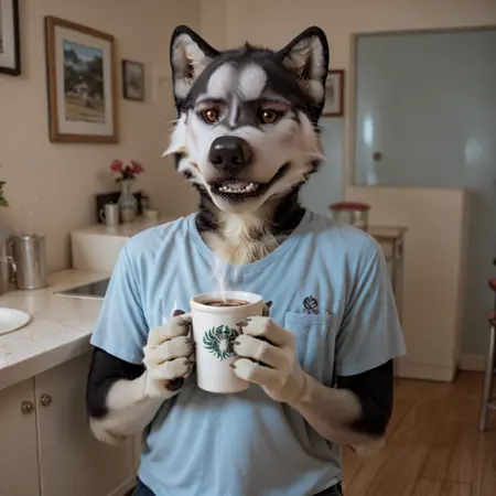 トリガーワード: verbeger, wolf, furry, anthro, male, canine, brown fur, white underbelly, black nose, black lips, brown eyes