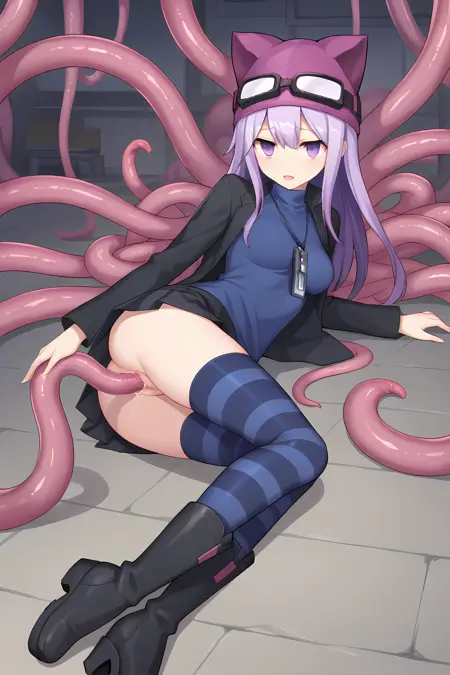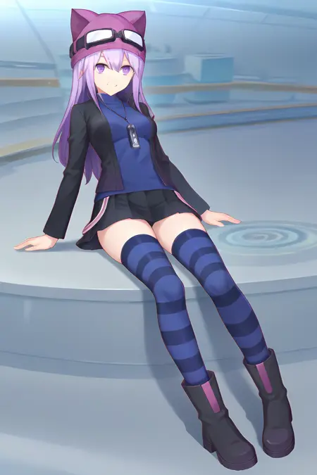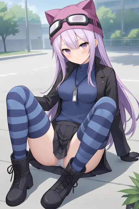 black jacket blue shirt black skirt striped thighhighs black boots animal hat goggles on head armband