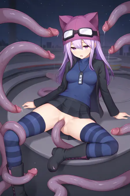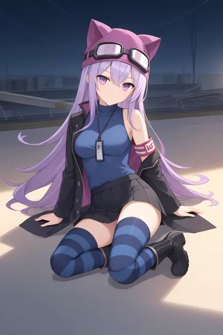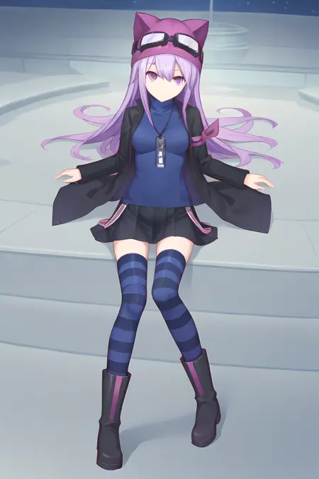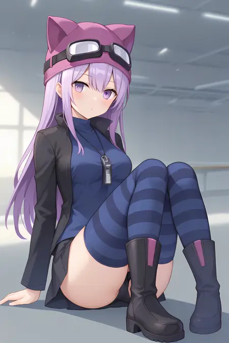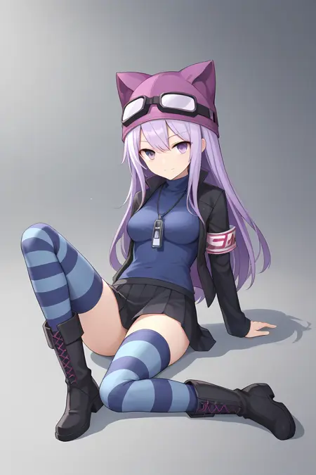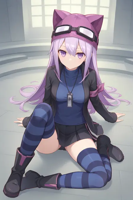 黒いジャケット、青いシャツ、黒いスカート、縞模様のタイツ、黒いブーツ、動物の帽子、頭にゴーグル、アームバンド