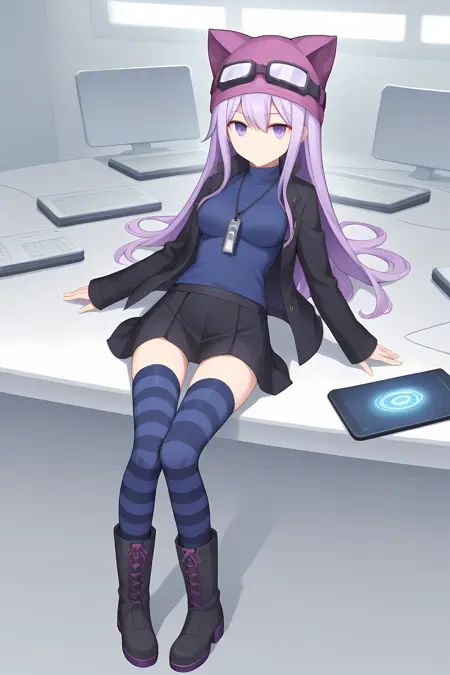 紫髪、紫目、長い髪、デジヴァイス、首にデジヴァイスを下げている