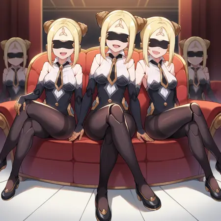 HoD, HoDoll, blonde hair, blindfold, covered eyes, doll joints, forehead mark, parted bangs, double hair bun, hair ornament, mechanical hands, gold gloves, black leotard, gold trim, shirt under leotard, white shirt, sleeveless shirt, ribbed shirt, collared shirt, long gloves, black gloves, gold necktie, clothing cutout, black pantyhose, platform footwear, shoes, spiked footwear, leg joints,