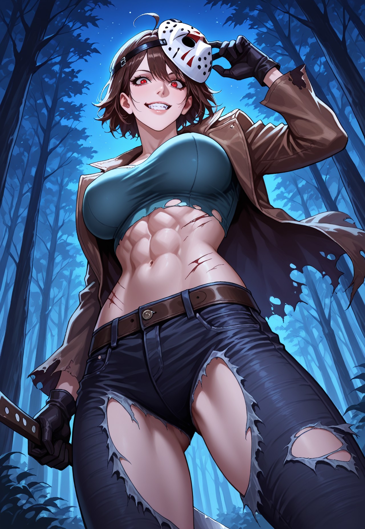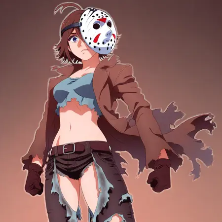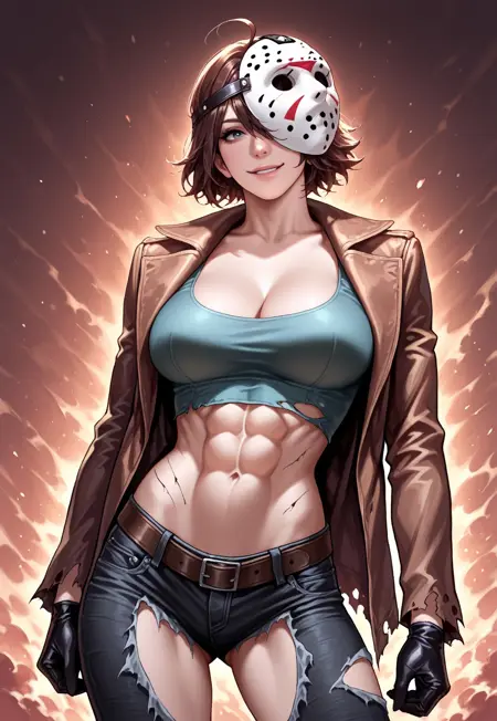 - brown hair, big breasts, torn clothes, jacket, crop top, midriff, gloves, torn jeans, boots,