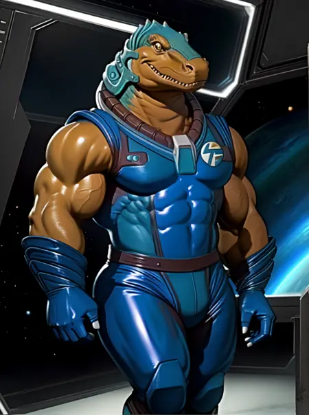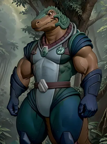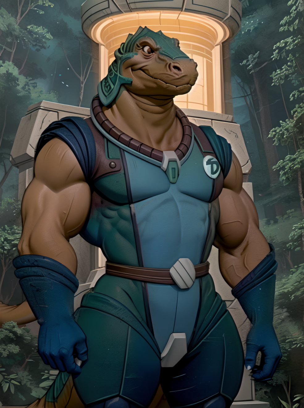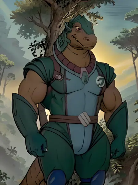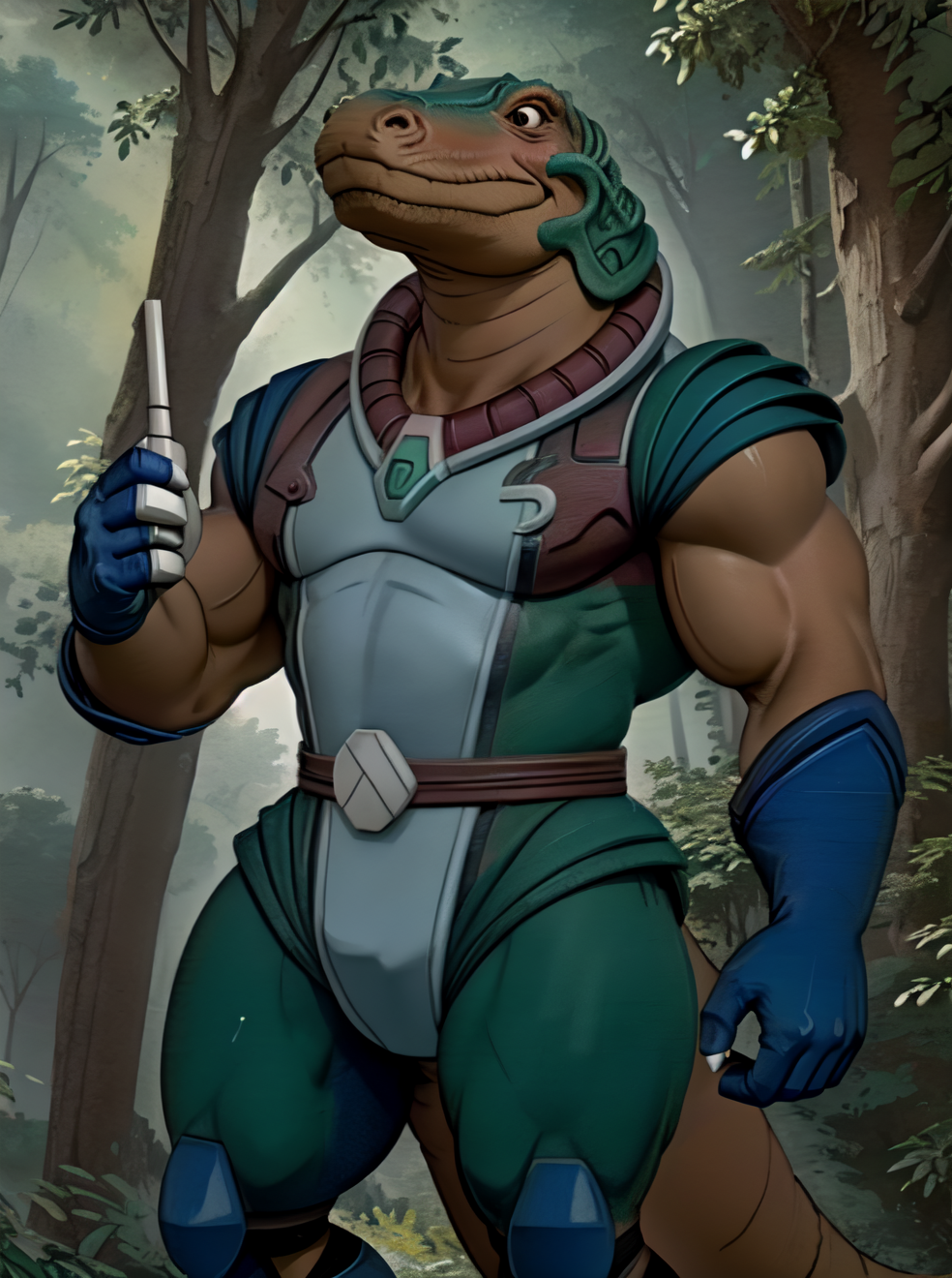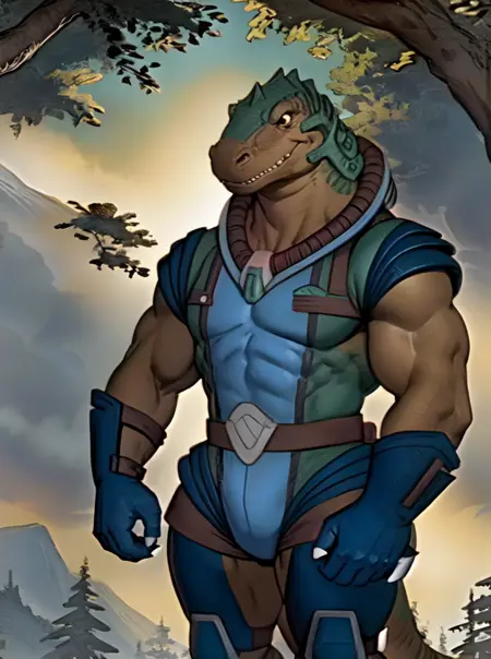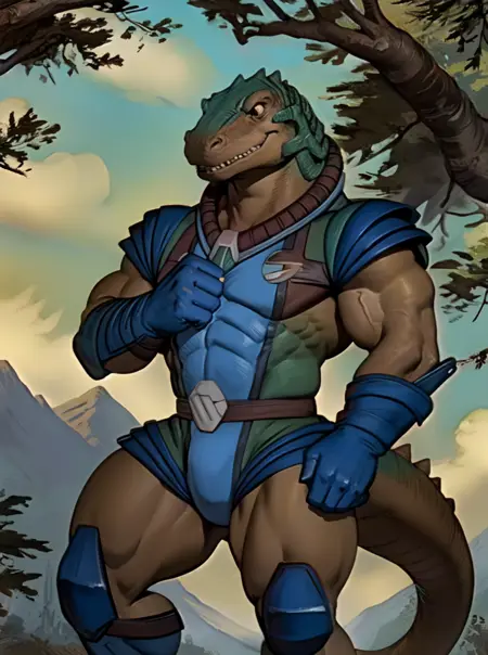 이 모델의 프롬프트는 Allo, Dinosaucers, dinosaur, muscular, armor, chest armor, brown skin입니다.
