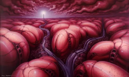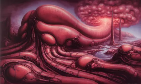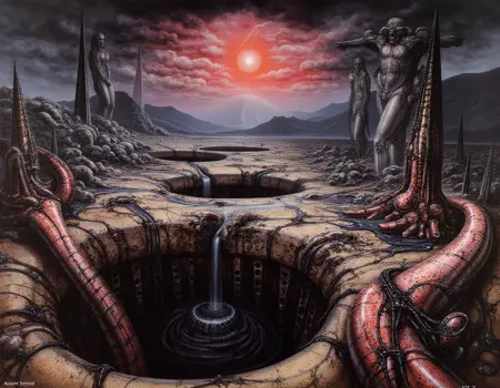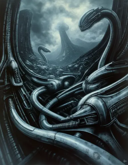 프롬프트: 바이오메카닉, 산업적, 에어브러시, 단색 등의 용어를 사용해보세요. "H.R. 지거의 전통적인 아트워크로 상세하게 묘사된..." 같은 문장으로 시작해보세요.