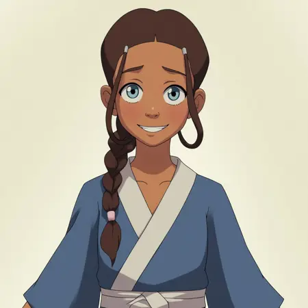 Katara, 밝은 갈색 피부, 파란 눈, 갈색 머리카락을 가진 여성으로, 한 줄의 땋은 머리카락을 하고 있다. 그녀는 허리에 흰색 띠를 매단 전통적인 파란 로브를 입고 있다.