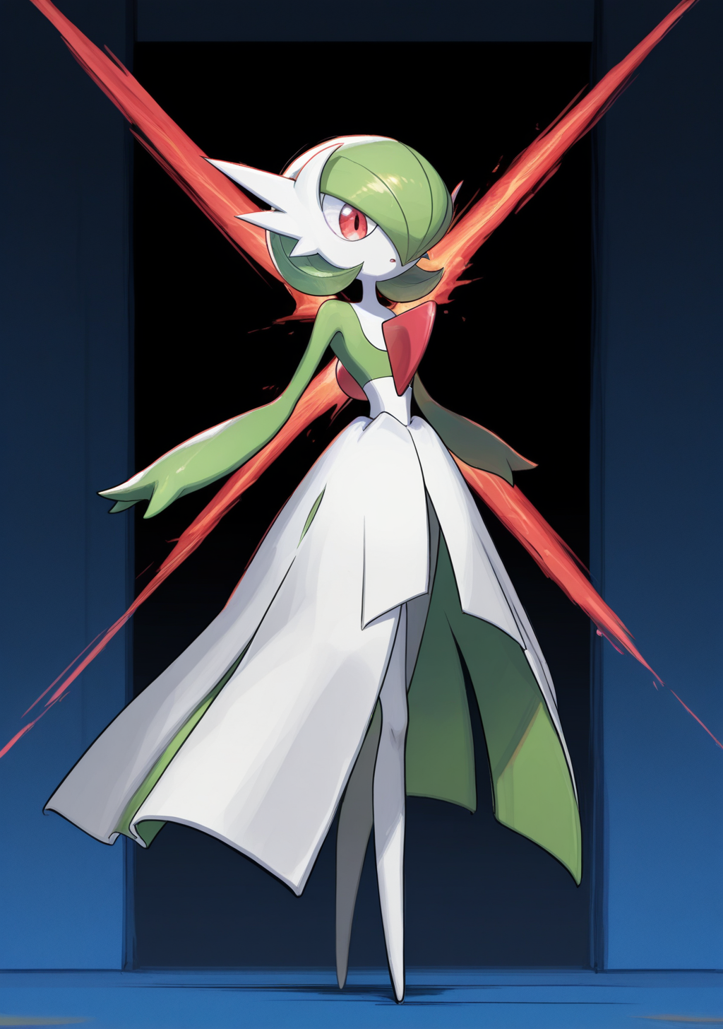 プロンプト: ガルーラ、白い肌、短い髪、赤い目、白いドレス、ポケモン(生物)、胸にある赤い紋章、緑の袖、ツヤあり、